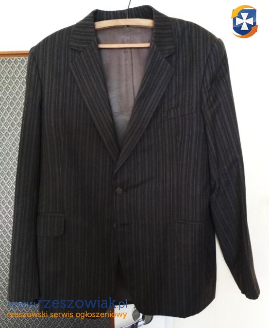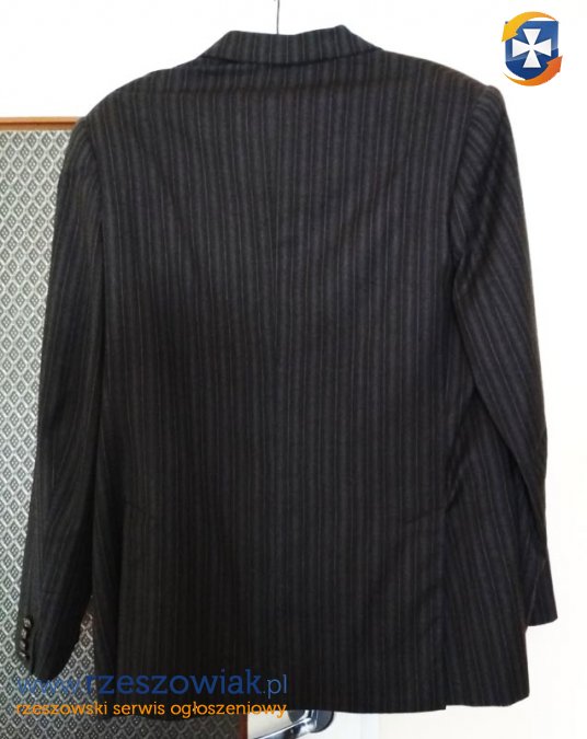 marynarka ciemnoszara (w ciemne paski), wymiary: długość rękawa od zewnętrznej strony (od ramienia): 68cm , plecy (całe z kołnierzem): 82cm , szerokość w ramionach na płasko: 51cm, szerokość w pasie (na płasko): 58cm, stan bardzo dobry, bez uszkodzeń i plam, sprzedam 15zł