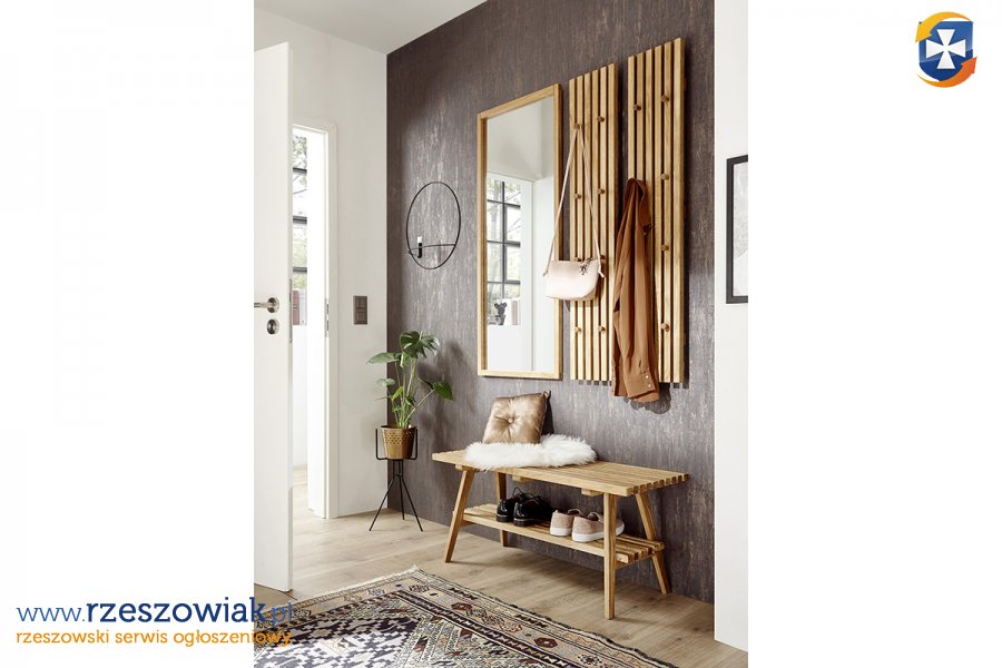 Meble do przedpokoju obejmują bryły z kolekcji Alwar. Meble wykonane są z drewna dębowego olejowanego.