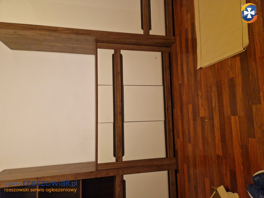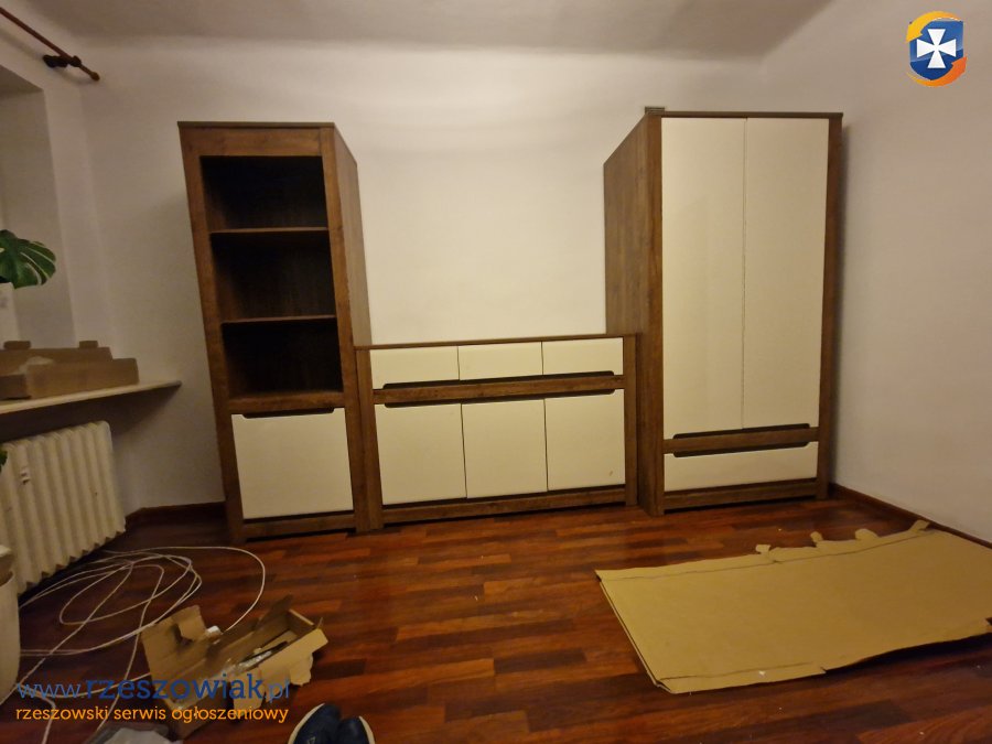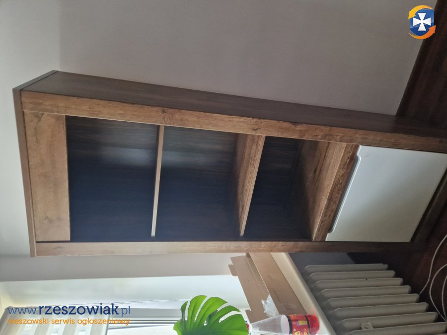 Meble ścienne do sprzedania. Zestaw składa się z komody, słupka i szafy. Widoczne ślady użytkowania, ale w dobrym stanie. Wymiary:
