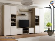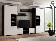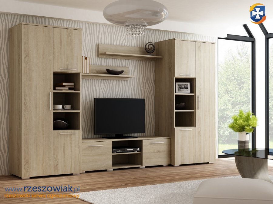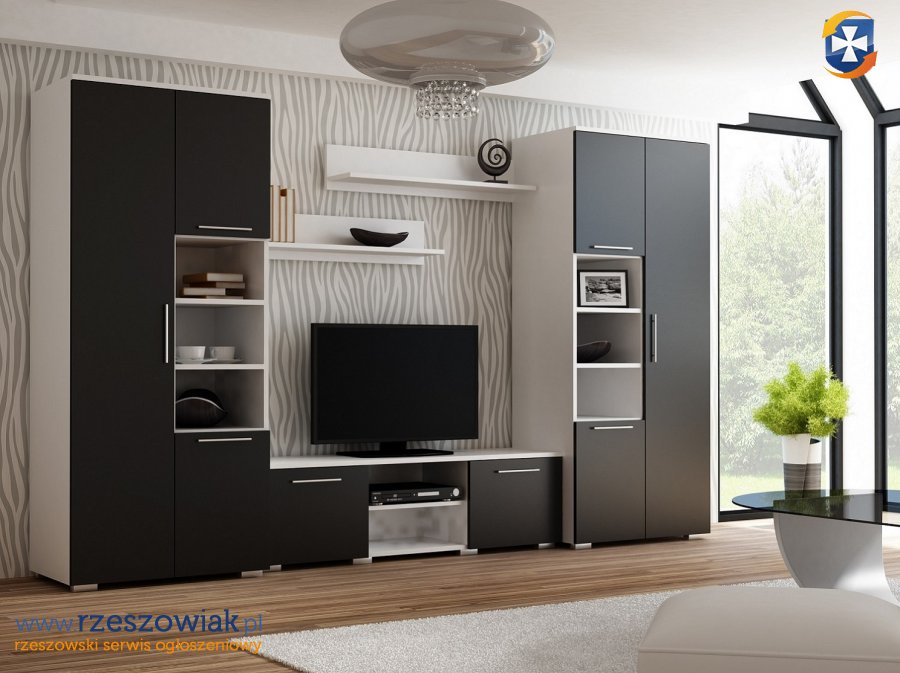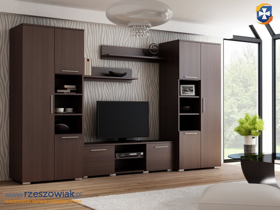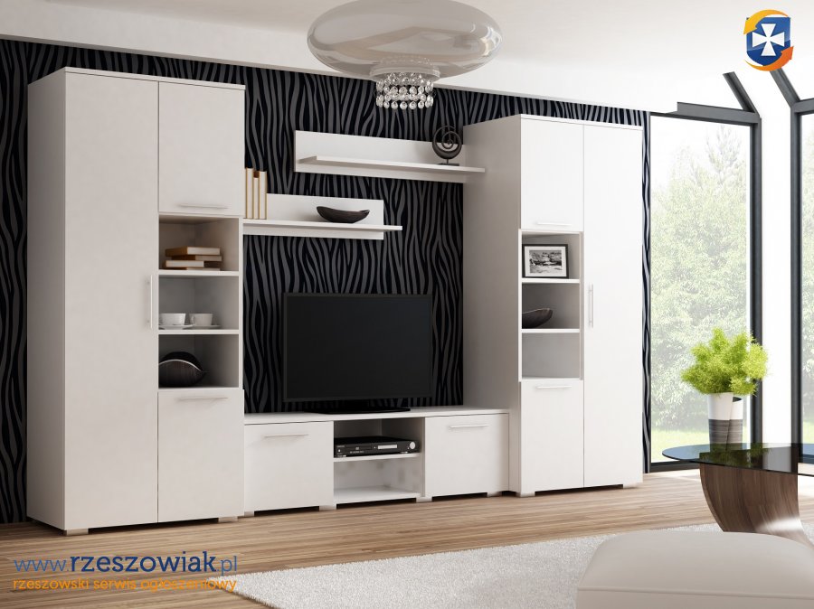 W skład meblościanki wchodzą: 2 szafy, szafka rtv oraz 2 półki wiszące.