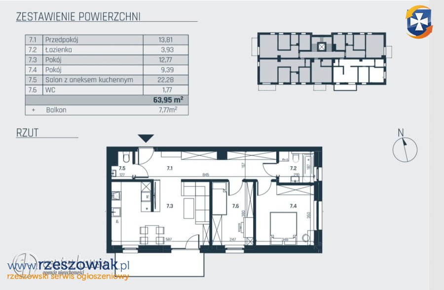 63.07m2- 3 pokoje, balkon o pow. 7.77m2 cena 630 700,00 zł