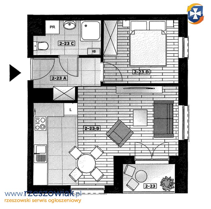 - układ: salon z aneksem kuchennym + sypialnia;