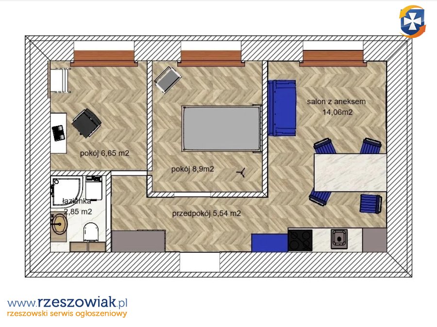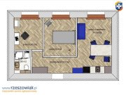 - układ: salon z aneksem kuchennym + 2 sypialnie;