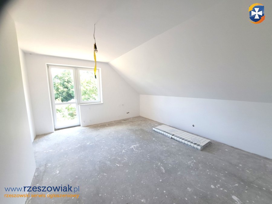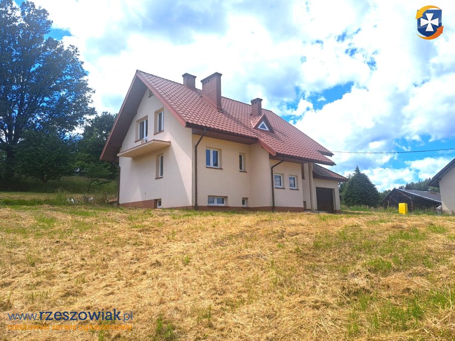 Dom posiada dwie kondygnacje mieszkalne: parter i poddasze użytkowe oraz dodatkowe podpiwniczenie o powierzchni 37 mkw. Budynek został oddany do użytkowania w 2018 roku. Zbudowany z pustaka, kryty blachodachówką, wyposażony w białe okna PCV i drzwi wejściowe antywłamaniowe. Na podłogach wylewki betonowe, na ścianach białe tynki. Na parterze przewidziano wiatrołap, przedpokój, salon, otwartą kuchnię ze spiżarką, pokój, garderobę, łazienkę, garaż, taras. Na piętrze: 3 sypialnie, łazienka, garderoba, przedpokój z klatką schodową, balkon. Media: prąd, gaz, wodociąg i kanalizacja.
