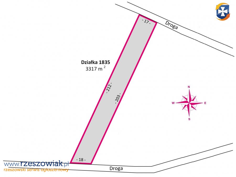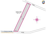 Nieruchomość w kształcie prostokąta o wymiarach 17 m szerokości na 212 m długości, oznaczona numerem ewidencyjnym: 1835. W sąsiedztwie dostępny jest prąd. Bezpośredni dojazd utwardzoną drogą gminną. Istnieje możliwość zakupu działki sąsiedniej o powierzchni 59,58 ar.
