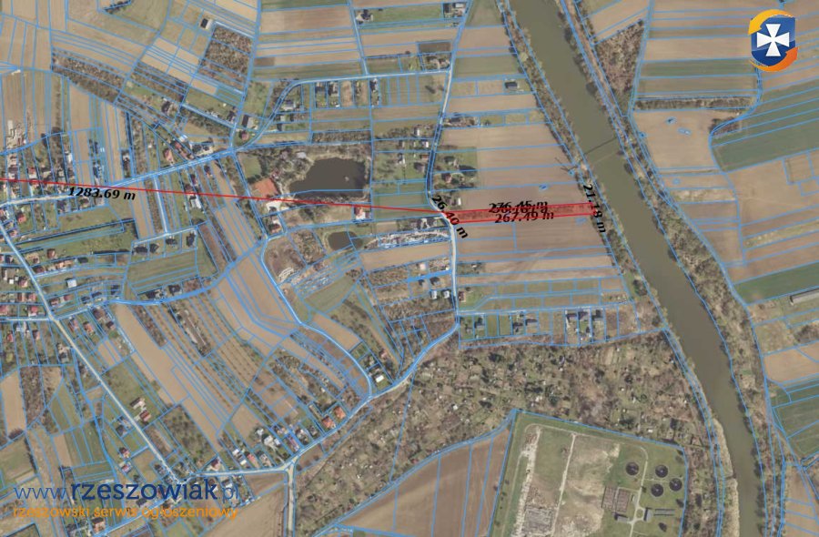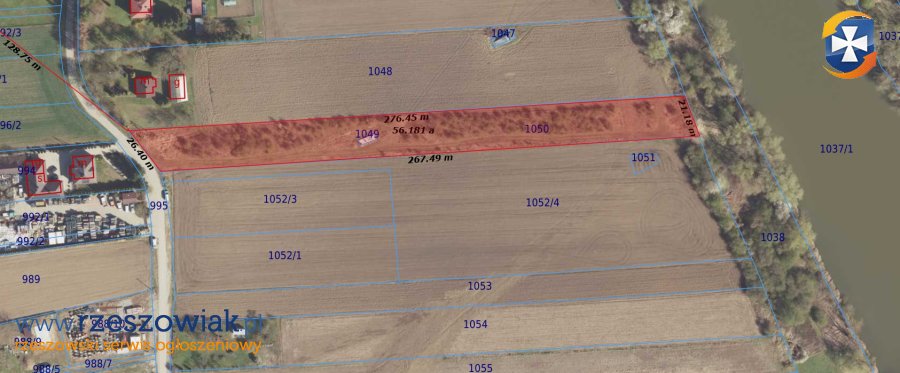 Działka: ok 56 ar o kształcie prostokąta 21x275m. Nr działki: 1050