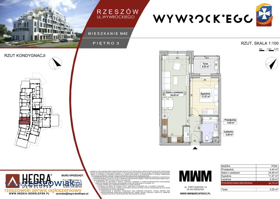 Na sprzedaż mieszkanie M42 o powierzchni 44,75 m2, położone na 3 piętrze nowoczesnego budynku przy ul. Wywrockiego 11 w Rzeszowie. Lokal z ekspozycją zachodnią oraz tarasem o powierzchni 4,52 m².