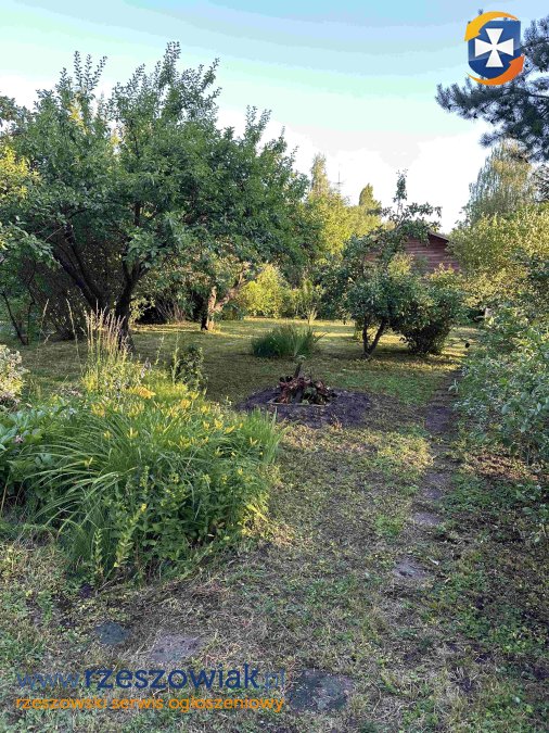 Przy ulicy Armii Krajowej w Rzeszowie, na ogródku drewniany domek, drzewa/krzewy owocowe.
