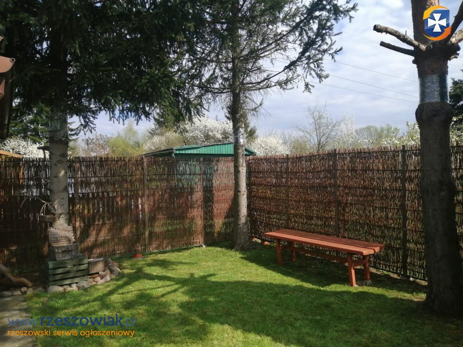 Na działce znajduje się domek z tarasem oraz niewielkim pomieszczeniem na narzędzia i kosiarkę. Domek jest w dobrym stanie. W środku są meble, lodówka, mikrofalówka, czajnik elektryczny, kuchenka elektryczna i radio. Do wyposażenia dochodzi też składany plastikowy stół i krzesła. Na tarasie stoi mniejszy stół oraz cztery drewniane krzesła, hamak, dwie brazylijskie huśtawki i huśtawki dla dzieci.