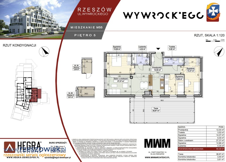 Na sprzedaż przestronny apartament M55 o powierzchni 84,3 m2, położony na 5 piętrze budynku przy ul. Wywrockiego 11 w Rzeszowie. Lokal o ekspozycji północno-wschodnio-południowej, z tarasem o powierzchni 38,97 m2.