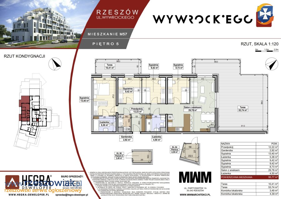 Na sprzedaż przestronny apartament M57 o powierzchni 95,77 m2, położony na 5 piętrze budynku przy ul. Wywrockiego 11 w Rzeszowie. Lokal o ekspozycji północno-zachodniej, z dwoma tarasami o łącznej powierzchni 64,15 m2.