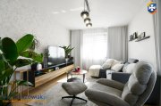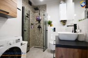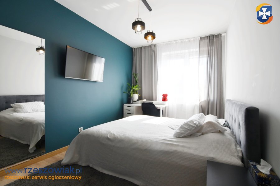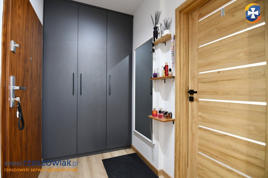 Mieszkanie umeblowane jak na zdjęciach. Na wyposażaniu mieszkania min. kuchnia w zabudowie z płytą gazową, piekarnikiem, zmywarką oraz lodówką. W salonie narożnik z funkcją spania, stolik kawowy, stół i krzesła, fotel, stolik RTV + telewizor. W sypialni łóżko z materacem, stolik nocny, szafa, biurko z krzesłem. W łazience kabina prysznicowa z deszczownicą i odpływem liniowym, pralka, umywalka z lustrem, geberit, szafki. W przedpokoju szafa w zabudowie, lustro. W oknach zamontowane są rolety.