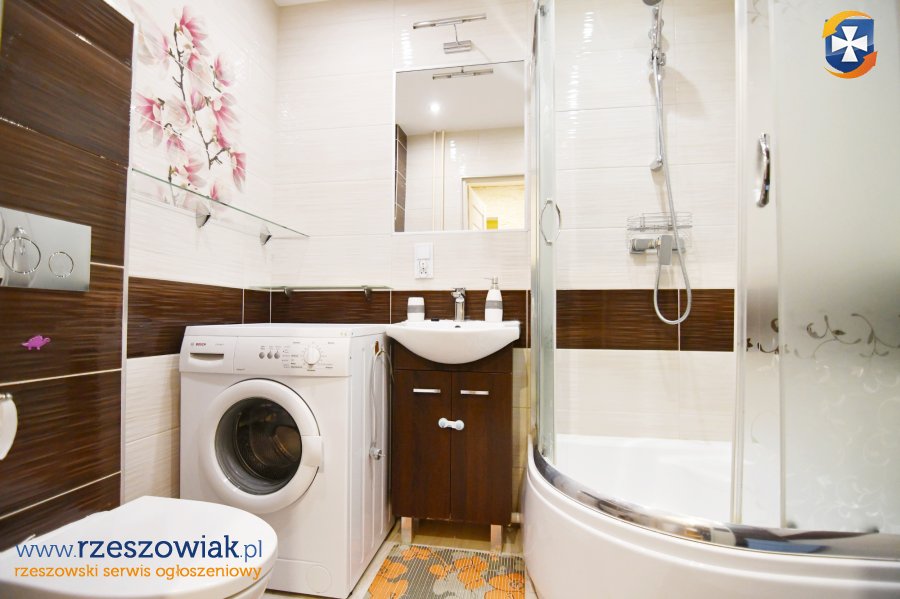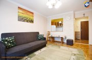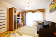 Na wyposażaniu mieszkania min. w kuchni kuchenka gazowa z piekarnikiem, mikrofalówka i lodówka. W salonie rozkładana kanapa, meblościanka z telewizorem, ława. W sypialni wersalka, szafa w zabudowie z lustrem. W łazience kabina prysznicowa, pralka, umywalka z lustrem, geberit. W przedpokoju szafka na buty, wieszak.