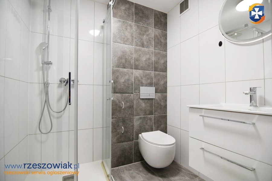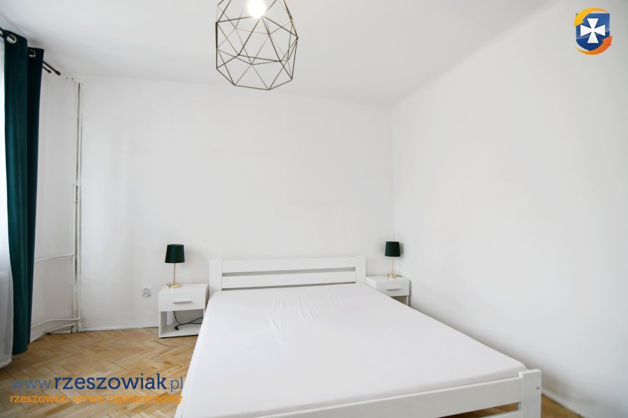 Na wyposażaniu mieszkania min. w kuchni kuchenka elektryczna, piekarnik, pralka i lodówka (nie ma na zdjęciach), stół i krzesła. W łazience kabina prysznicowa, umywalka z lustrem, geberit. Pokoje umeblowane jak na zdjęciach: w większym pokoju duży skórzany narożnik z funkcją spania, 2 fotele, stół i krzesła, biurko, komoda. W mniejszym pokoju duże łóżko z materacem, stoliki nocne, szafa, komoda, biurko. W przedpokoju szafka na buty, wieszak.
