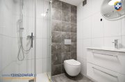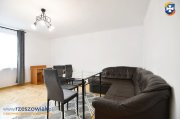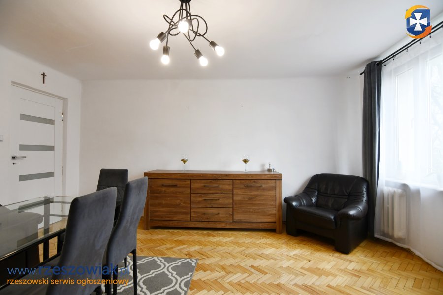 Na wyposażaniu mieszkania min. w kuchni kuchenka elektryczna, piekarnik, pralka i lodówka (nie ma na zdjęciach), stół i krzesła. W łazience kabina prysznicowa, umywalka z lustrem, geberit. Pokoje umeblowane jak na zdjęciach: w większym pokoju duży skórzany narożnik z funkcją spania, 2 fotele, stół i krzesła, biurko, komoda. W mniejszym pokoju duże łóżko z materacem, stoliki nocne, szafa, komoda, biurko. W przedpokoju szafka na buty, wieszak.