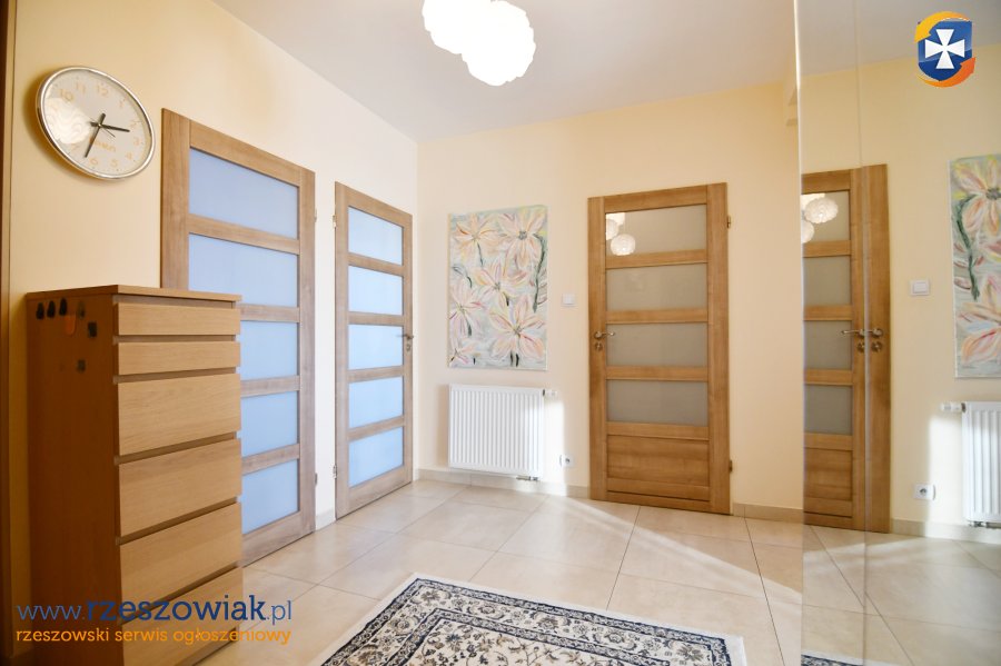 Na wyposażaniu mieszkania min. kuchnia w zabudowie z płytą indukcyjną, piekarnikiem i lodówką, stół i krzesła. W salonie duży rozkładany narożnik, telewizor. W każdym pokoju łózko, szafa, komoda/biurko. W łazience wanna, pralka, geberit, umywalka z lustrem, liczne szafki. W przedpokoju 2 szafy z lustrami, komoda. Mieszkanie posiada ogrzewanie podłogowe w łazience i przedpokoju.