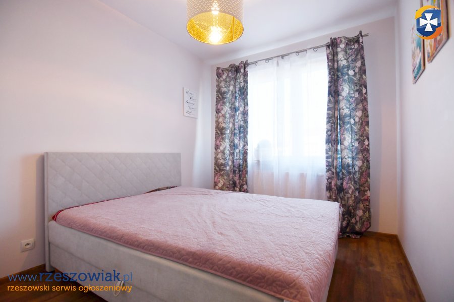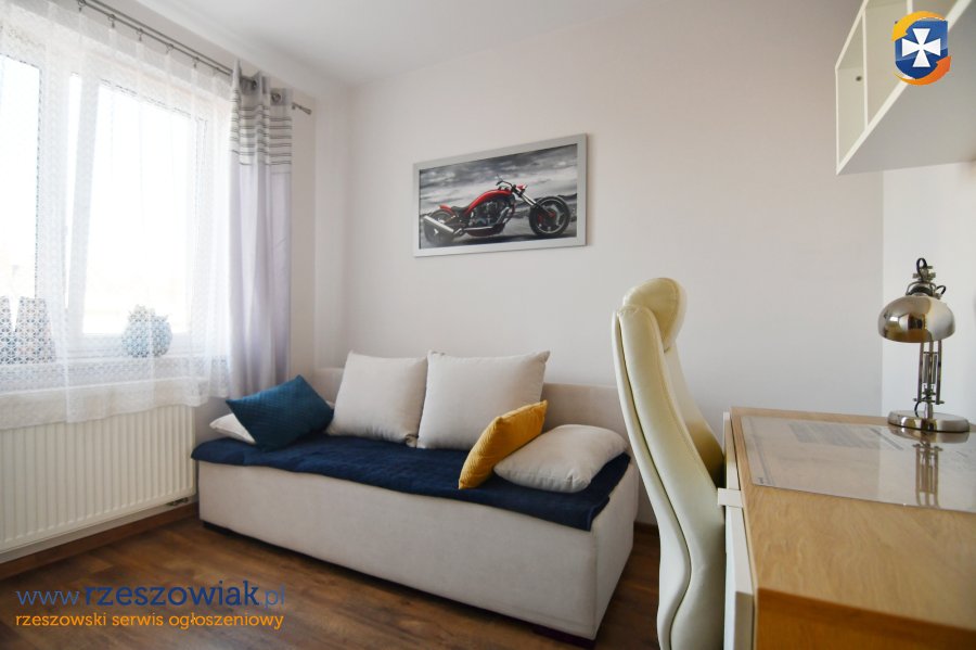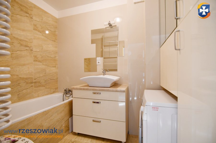 Na wyposażaniu mieszkania min. kuchnia w zabudowie z płytą indukcyjną, piekarnikiem i lodówką, stół i krzesła. W salonie duży rozkładany narożnik, telewizor. W każdym pokoju łózko, szafa, komoda/biurko. W łazience wanna, pralka, geberit, umywalka z lustrem, liczne szafki. W przedpokoju 2 szafy z lustrami, komoda. Mieszkanie posiada ogrzewanie podłogowe w łazience i przedpokoju.