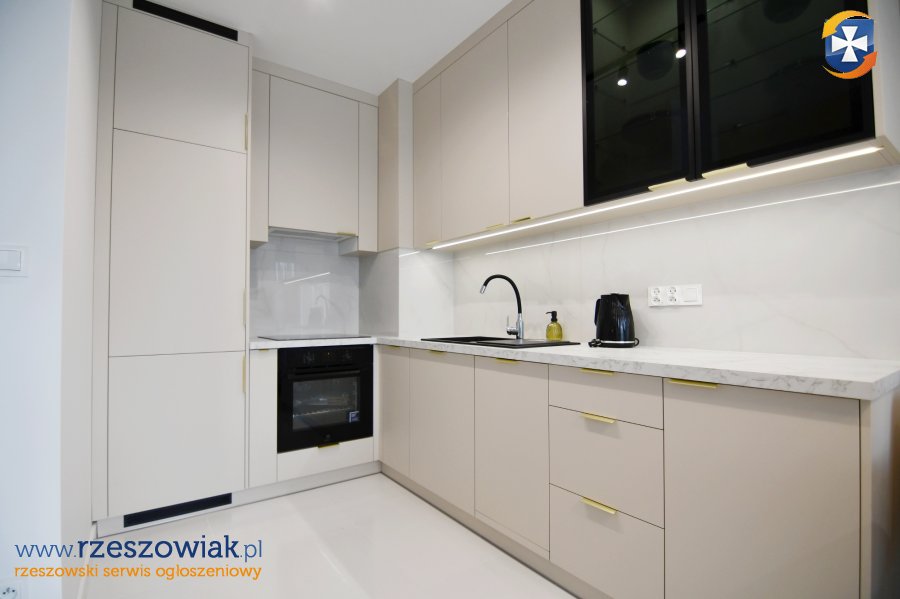 Na wyposażaniu mieszkania min. kuchnia w zabudowie z płytą indukcyjną, piekarnikiem, zmywarką i lodówką. W łazience kabina prysznicowa, pralka, umywalka z lustrem, geberit, szafki. Pokoje umeblowane jak na zdjęciach. W salonie kanapa z funkcją spania, stół i krzesła, stolik RTV + telewizor. W sypialni łóżko z materacem 140x200 cm, szafa. W przedpokoju szafa wnękowa. Mieszkanie wyposażone w ogrzewanie podłogowe w łazience.