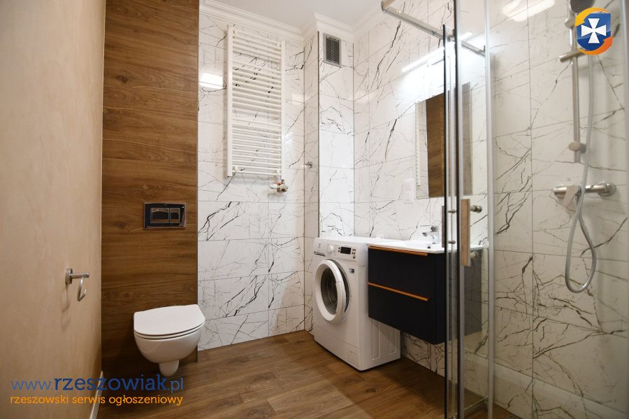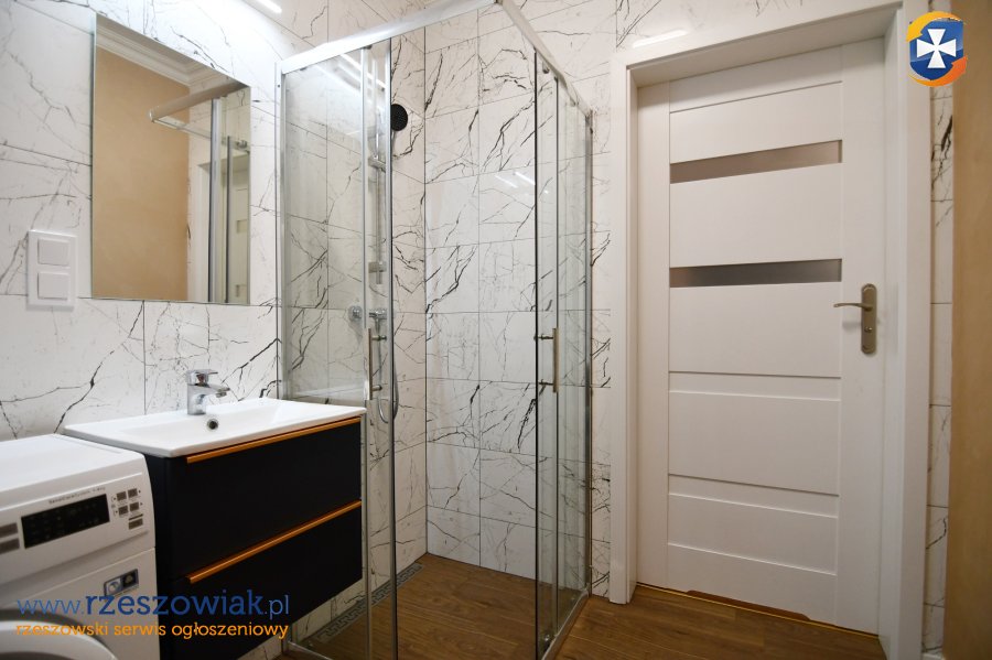 Mieszkanie umeblowane jak na zdjęciach. Na wyposażaniu mieszkania min. kuchnia w zabudowie z płytą indukcyjną, piekarnikiem, zmywarką i lodówką, w łazience kabina prysznicowa, pralka, umywalka z lustrem, geberit. W pokoju rozkładana kanapa o powierzchni spania 150x200, stolik RTV + telewizor 49", stół i krzesła. W przedpokoju duża szafa w zabudowie.
