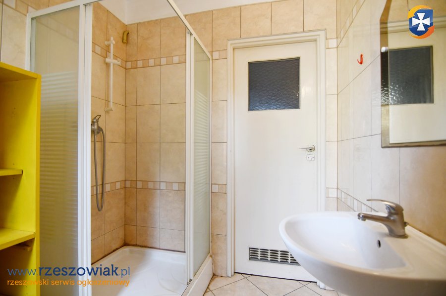łazienka: kabina prysznicowa, umywalka z lustrem, pralka.
