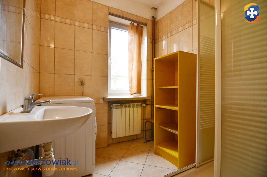 łazienka: kabina prysznicowa, umywalka z lustrem, pralka.