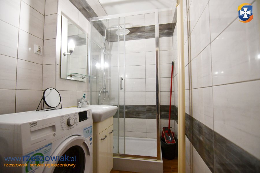 Na wyposażaniu mieszkania min. kuchnia w zabudowie z kuchenką gazową, piekarnikiem, mikrofalówką i lodówką. W pokoju: łóżko, szafa, biurko, komoda. W łazience kabina prysznicowa z deszczownicą, pralka, umywalka z lustrem. W przedpokoju komoda, wieszak, lustro.