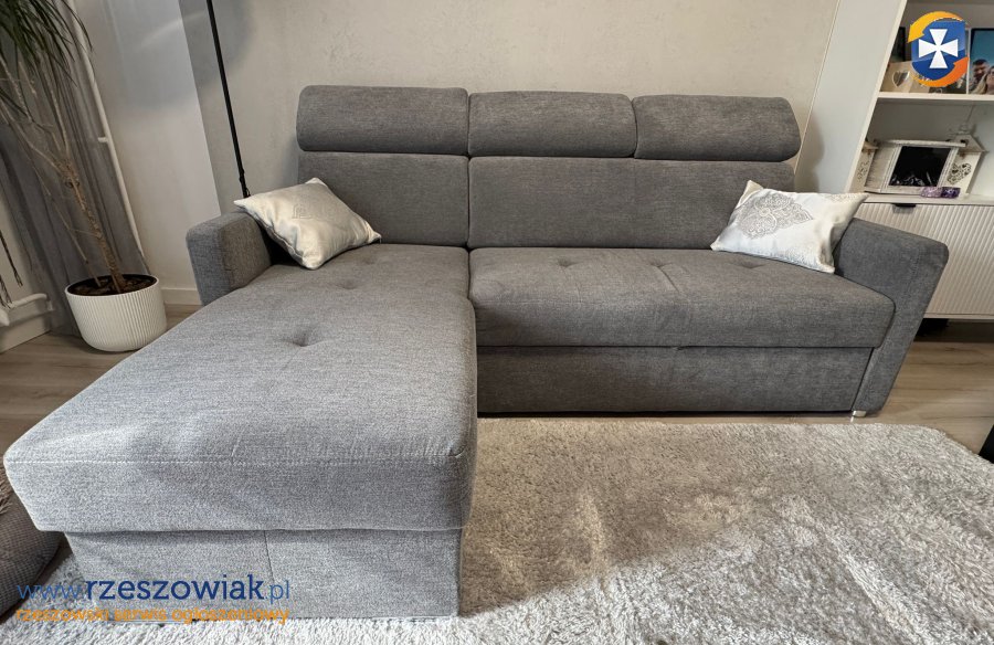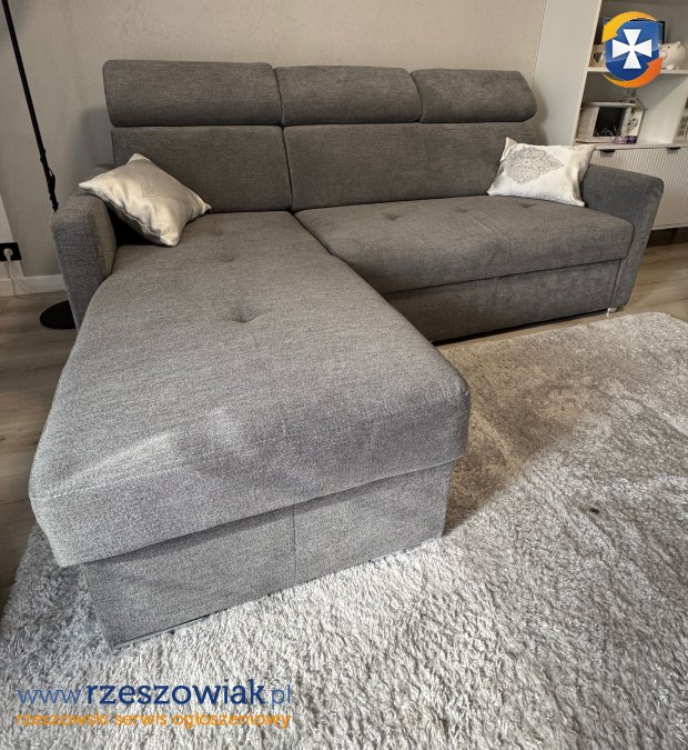 Narożnik z funkcją spania i pojemnikiem to dobra propozycja także do mniejszych wnętrz, gdzie pokój dzienny służy za sypialnię. W mig zmienisz kanapę w przestronne łóżko dzięki mechanizmowi rozkładania typu delfin. Wygodę, zarówno podczas oglądania seriali, jak i nocnego wypoczynku, zapewniają sprężyny faliste i pianka w siedzisku. Regulowane zagłówki pozwalają dostosować wysokość oparcia do własnych preferencji.