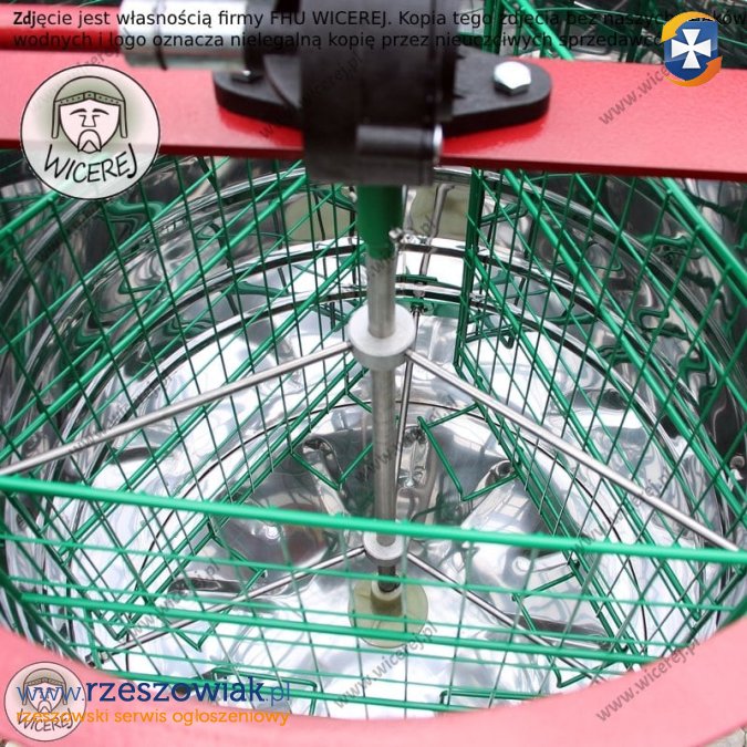 ⢠Kosz (wirnik) wykonany ze stali powlekanej proszkowo. WIRNIK WZMOCNIONY JEST DODATKOWO OSIĄ CENTRALNĄ. Kosz miodarki , wykonany z prętów stalowych powlekanych proszkowo, rozmieszczonych w sposób zabezpieczający ramki przed wyłamywaniem się plastrów podczas wirowania.