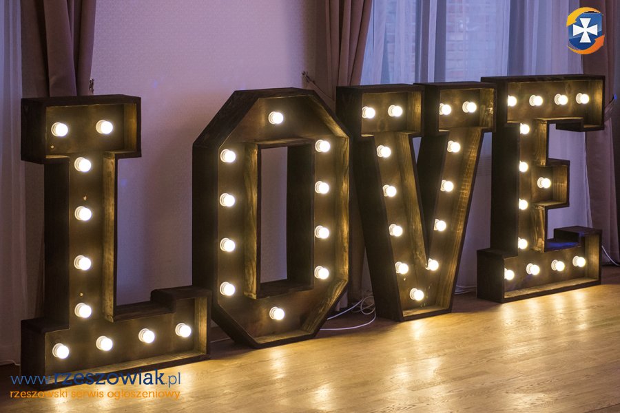 Napis wykonany w całości z drewna, litery są stabilne i masywne.