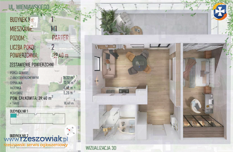 Mieszkanie o powierzchni 39,40m2, zlokalizowane na parterze bloku przy ulicy Wieniawskiego.