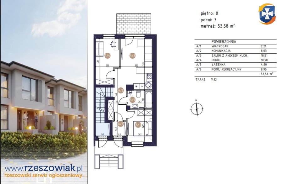PARTER - mieszkanie pow. 53.58m2, 3 pokoje, ogródek od 30.93m2 do 85,63m2