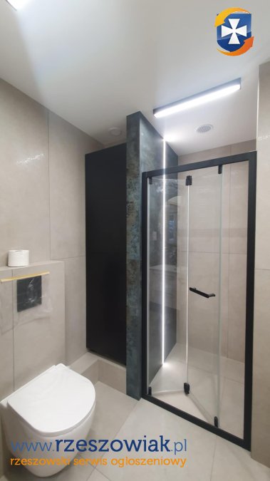 - w łazience kabina prysznicowa bez brodzika, wygodna szafka na detergenty, umywalka wraz z szafką, podwieszana muszla wc, lustro ścienne