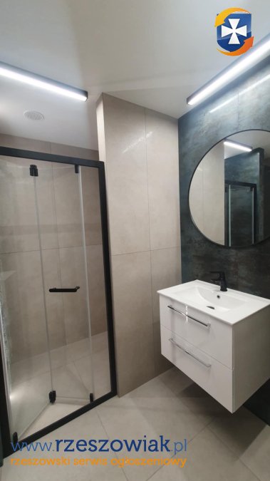 - w łazience kabina prysznicowa bez brodzika, wygodna szafka na detergenty, umywalka wraz z szafką, podwieszana muszla wc, lustro ścienne