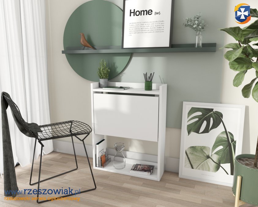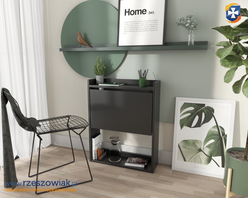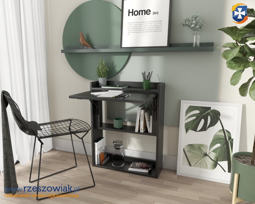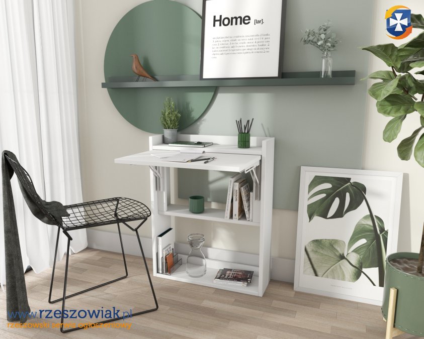 Nowoczesna forma biurka składanego to idealna opcja do małych mieszkań i domów. Produkt jest w formie regału z rozkładanym blatem. Produkt nie zajmuje zbędnego miejsca, a gdy tylko potrzebujesz roboczego blatu to wystarczy pociągnąć za półkę. Blat jest wystarczającej wielkości aby komfortowo pracować. Biurko wykonane jest z wysokiej jakości płyty laminowanej 18 mm. Produkt dostępny jest w dwóch wersjach kolorystycznych białym i czarnym.