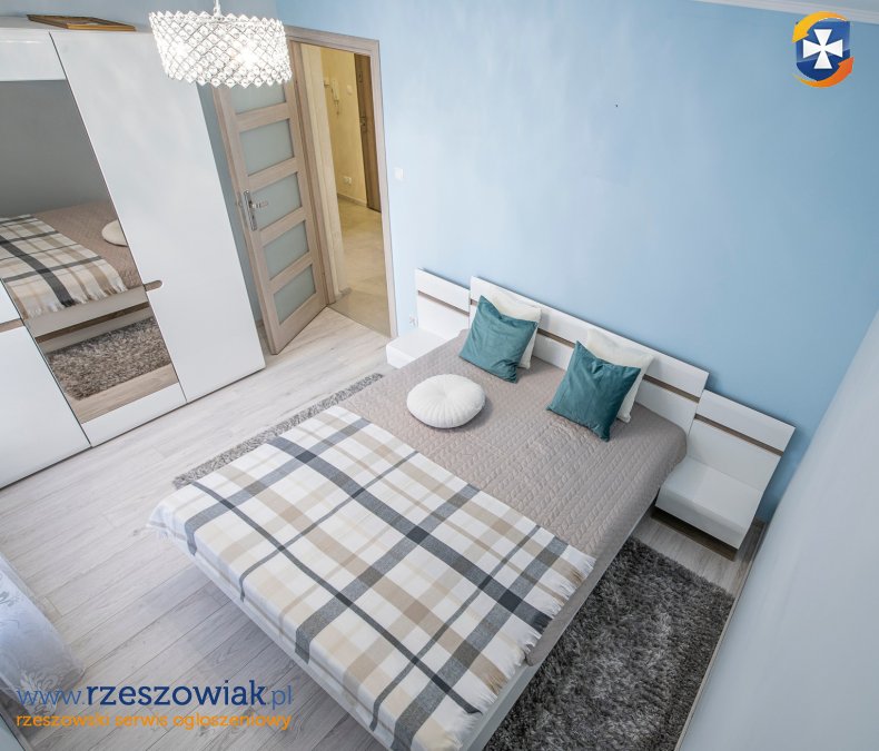 W sypialni znajduje się duże łóżko, szafki nocne i pojemna szafa, natomiast w przedpokoju duża szafa w zabudowie.
