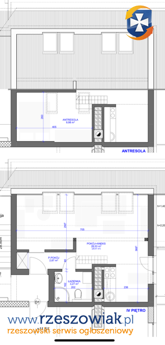 Dwupoziomowe: 34 M2 + antresola - sypialnia 10 M2.