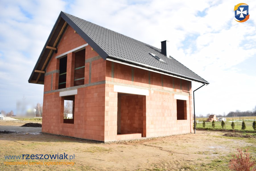 Dom posiada 2 kondygnacje (parter i poddasze), 5 pokoi w tym salon z jadalnią połączony z kuchnią z wyjściem na taras od strony południowo-zachodniej. Wewnątrz budynku są wykonane: wstępne wylewki, położone przewody pod kanalizację i wodę, przewód kominowy pod kominek w salonie, schody betonowe na poddasze, sufity żelbetowe. Dach dwuspadowy pokryty blachodachówką, orynnowanie.