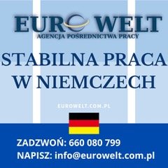 Agencja Pośrednictwa Pracy EURO WELT (KRAZ 12809) działa na rynku już od ponad 10 lat, skutecznie łącząc kandydatów z pracodawcami za granicą. Zaufanie setek zadowolonych pracowników to dla nas najlepsza rekomendacja. Zapewniamy wsparcie na każdym etapie â od aplikacji, przez wyjazd, aż po codzienne sprawy już na miejscu. Dołącz do grona osób, które za naszym pośrednictwem rozpoczęły stabilną pracę za granicą.