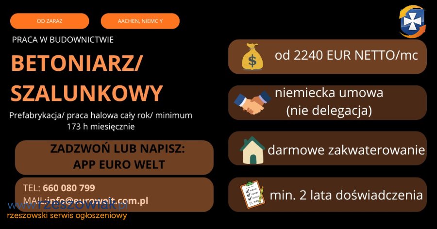 BETONIARZ / SZALUNKOWY -NIEMCY (AACHEN) |PRACA OD ZARAZ