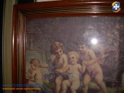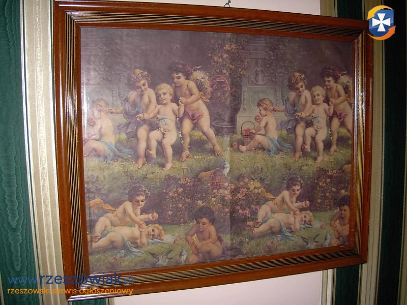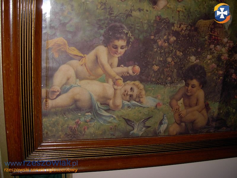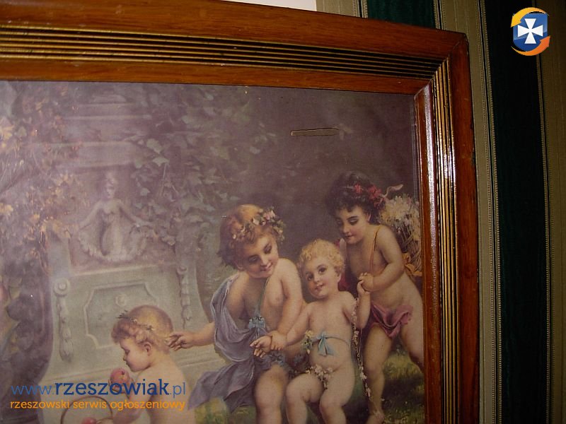 Obraz drewniana rama bardzo masywna stara za szkłem - przedstawia aniołki putta bawiące się na cmentarzu przy pięknych grobach.Bardzo stary w dobrym stanie do zawieszenia,dłg.59 x 71 cm.