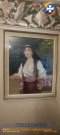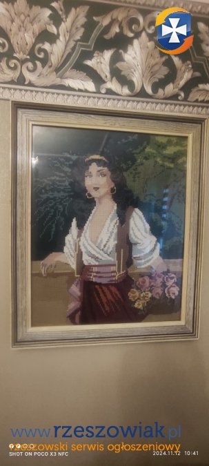 Obraz ręcznie haftowany gobelin -drewniana rama za specjalną do obrazów pleksa stan BDB gotowy do zawieszenia.przedstawia śliczną dziewczynę z kwiatami.Wysokość 48 x40 cm.