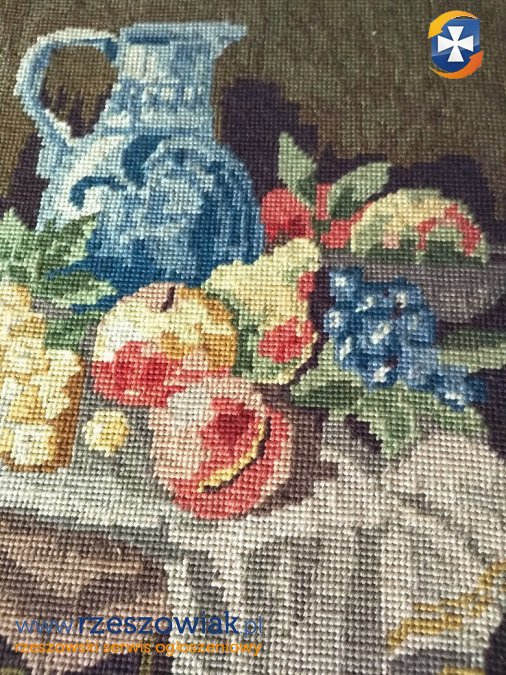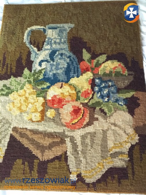 Obraz ręcznie haftowany naciągnięty na grubą dyktę,przedstawia Martwa Natura.Stan zachowania BDB. wymiary - dłg.44 x 34.