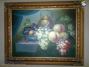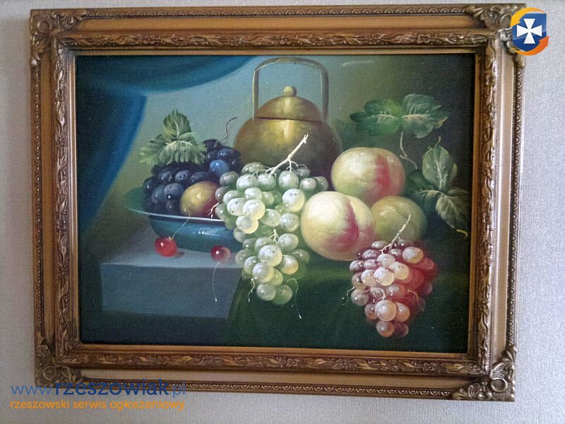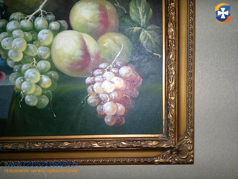 Obraz w drewnianej ramie dekorowana pomalowana na płótnie - Martwa Natura.Stan BDB.dłg.38 x szer.48 cm.