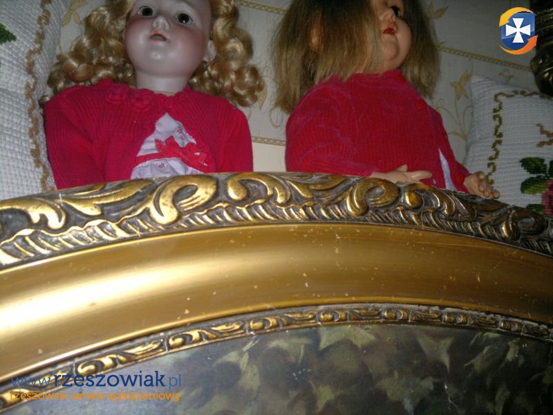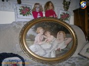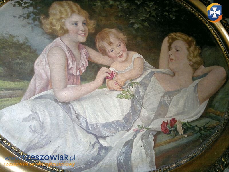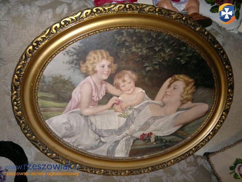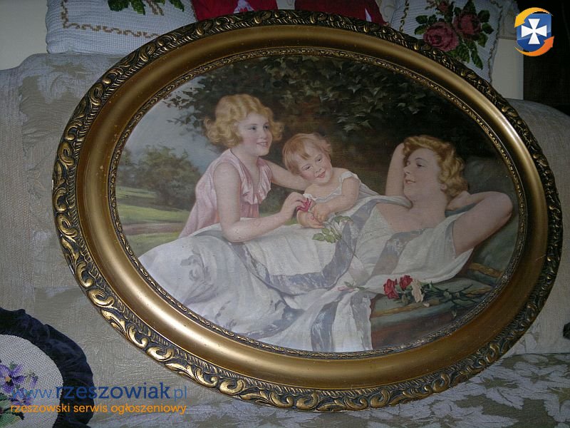Obraz w drewnianej ramie dekorowany złocony z rantem owalny - przedstawia szczęśliwe macierzyństwo. Dłg.87 x 68 cm.Stan - bdb.