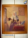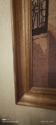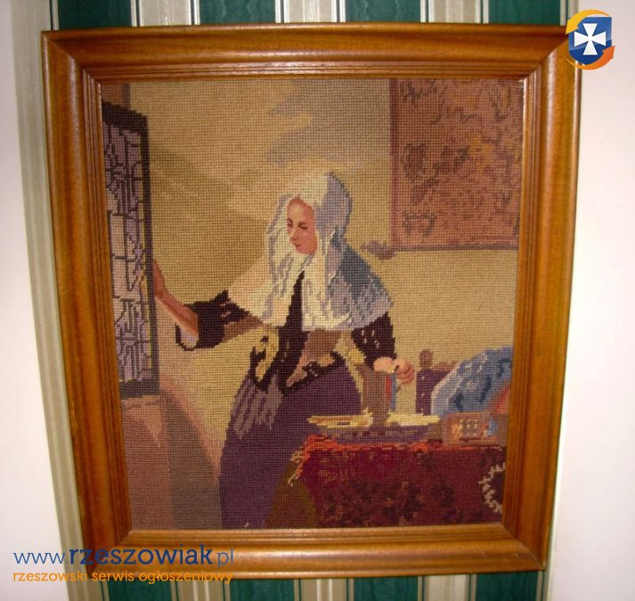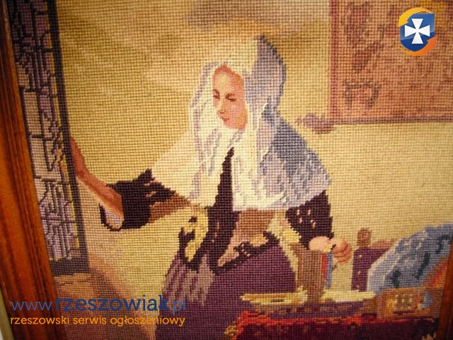 Obraz w dużej drewnianej ramie -gobelin ręcznie wykonany. stan gotowy do zawieszenia. wymiary - dłg.55 x 48 cm.