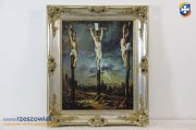Obraz w unikatowej pięknej ramie przedstawia druk z 1950 - 1999 - Ukrzyżowanie Dawid Teniers malował w 1676 r.obraz ciężki drewno dekorowane malowane złotem malarskim stan bdb dłg.65 x szer.55 cm.glębokość ramy 5 cm.