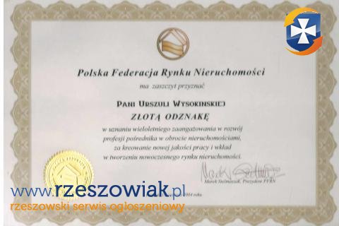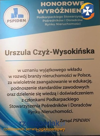 Od 18.06.2004roku posiadam ZŁOTĄ ODZNAKĘ otrzymaną od Polskiej Federacji Rynku Nieruchomości, a od 20.12.2025 wyróżnienie otrzymane od Podkarpackiego Stowarzyszenia Pośredników i Doradców Nieruchomości. Obecnie jestem na emeryturze i nadmiar wolnego czasu wykorzystuję na znalezienie optymalnego nabywcy na nieruchomość 601 873 474 Urszula Czyż-Wysokińska