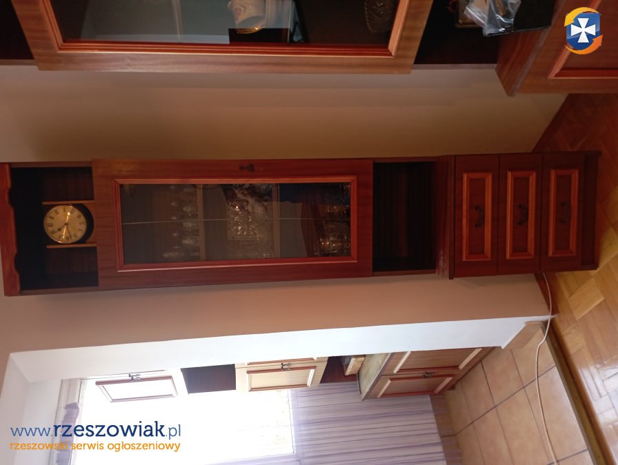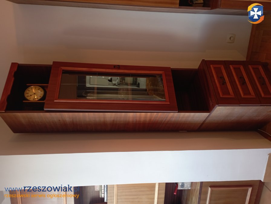 Oddam klasyczną, wysoką witrynę pokojową z przeszklonym frontem oraz trzema szufladami w dolnej części. Na górze otwarta wnęka dekoracyjna (bez wyposażenia widocznego na zdjęciach). Mebel stabilny, w dobrym stanie jak na lata użytkowania.