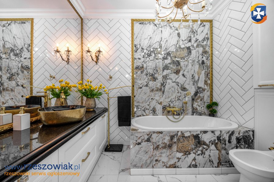 W nieruchomości m.in. granitowy blat kuchenny, meble z litego drewna, kryształowe żyrandole, drewniana podłoga oraz eleganckie płytki.
