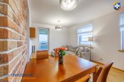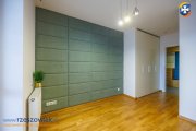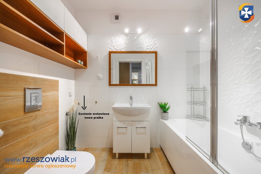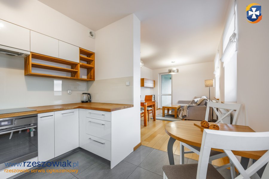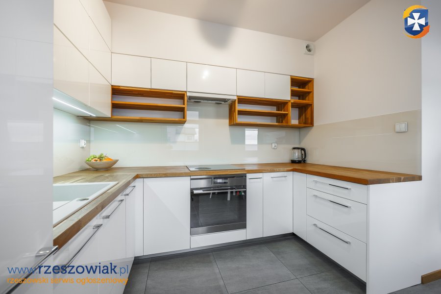 lodówka, zmywarka, płyta indukcyjna, okap, piekarnik oraz czajnik elektryczny. W pokojach znajdują się meble i pojemne szafy w zabudowie. Na podłogach ułożono deskę podłogową oraz płytki. Blaty w kuchni drewniane a szafy w hallu fornirowana.